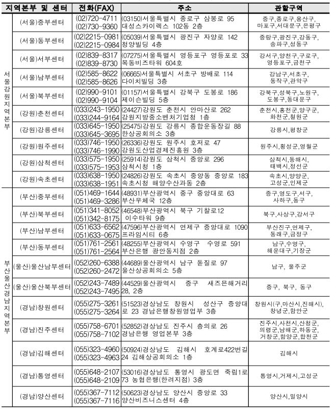 소상공인시장진흥단 지역센터 연락처 및 관할구역 정보입니다.