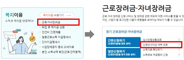 홈택스 웹사이트 기준으로 메인화면 오른쪽 상단 복지이음 (근로·자녀장려금) → 정기 근로장려금·자녀장려금의 신청안내대상여부조회에서 대상여부 확인하실 수 있습니다.